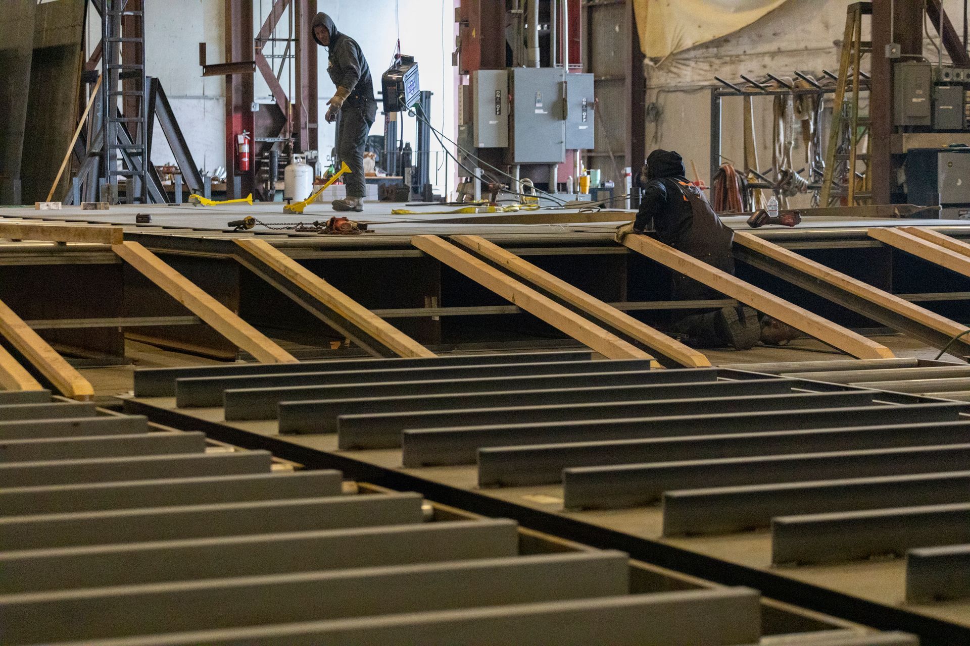 Workers in Fairhaven lay up interior sections of the barge 'Hannah', operated by Northline Seafoods. The Jones Act ensures domestic shipping routes use U.S. ships, and U.S. crews. Photo: Dan Tucker