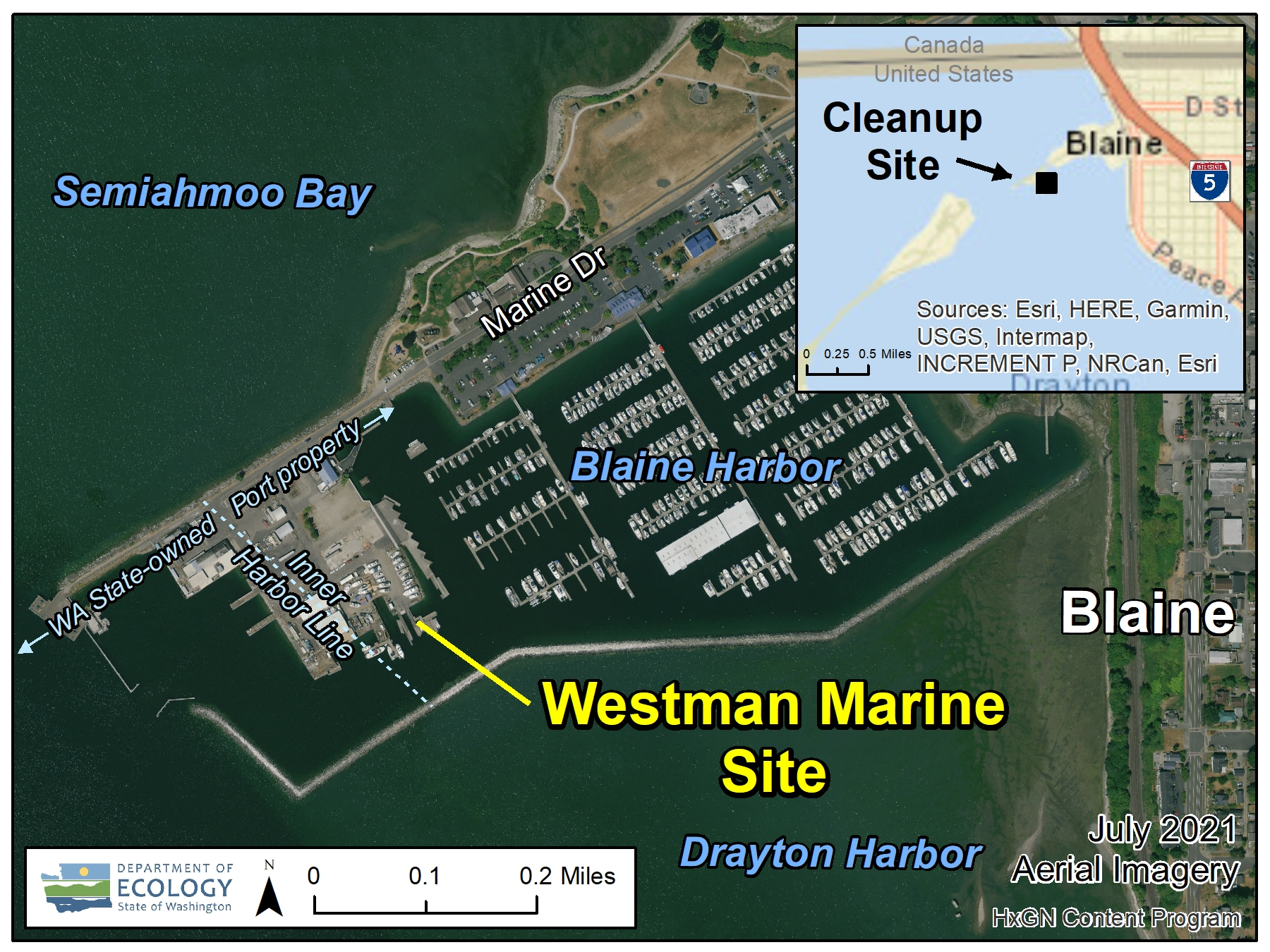 The Department of Ecology (DOE) is overseeing the cleanup of the Westman Marine site located at 218 McMillan Avenue in the Blaine Harbor industrial area. The Port of Bellingham is the 'Potentially Liable Person' (PLP) cleaning up the site.