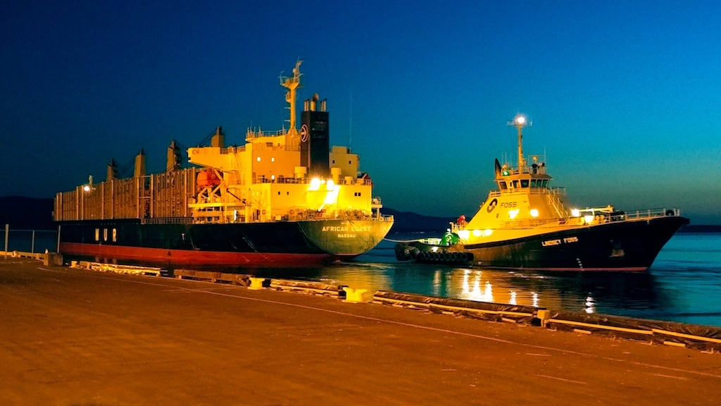 The tug Lindsey Foss, from Foss Maritime, escorts a ship into Bellingham Shipping Terminal. The Lindsey Foss uses MGO - Marine Gas Oil - a lower-sulfur, lower-emissions gas oil than standard diesel. Going forward, many tugs are converting to all-electric, LNG, or even hydrogen power. While the technology catches on, however, many existing tugs are converting to more emissions friendly, more sustainably sourced fuel oils, and Ports around Puget Sound are starting to make those fuels more available. Photo: Foss Maritime