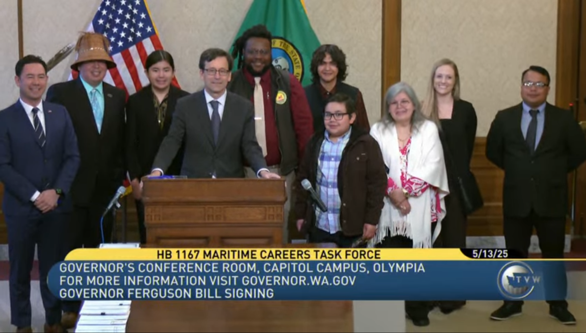 Ryan Davis, Legato Maritime, stands with Gov. Ferguson at the Maritime Career Task Force signing.